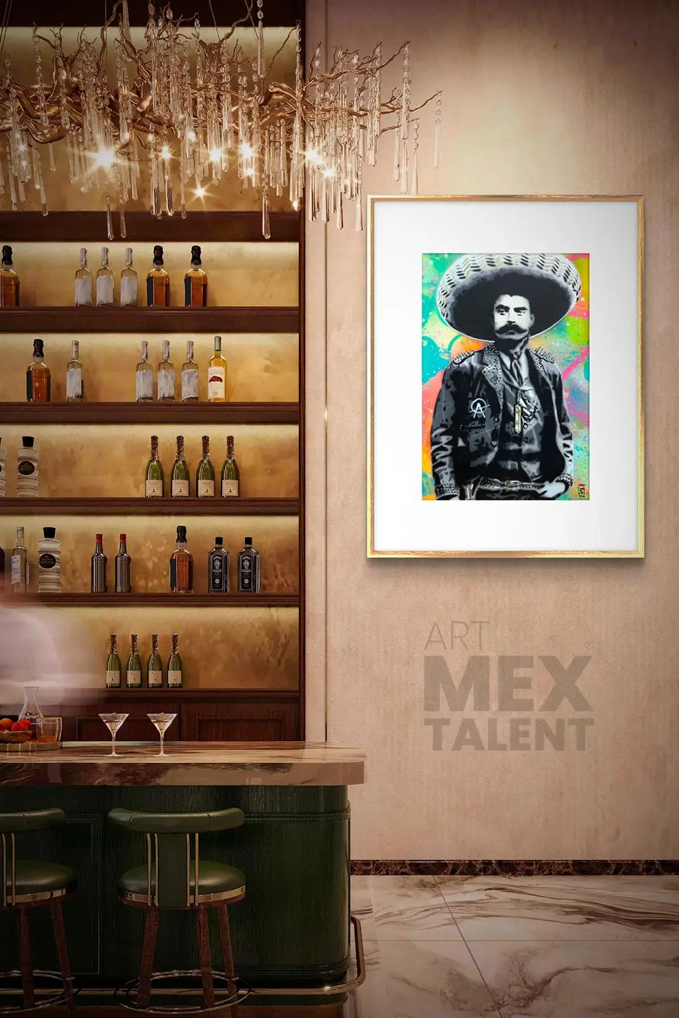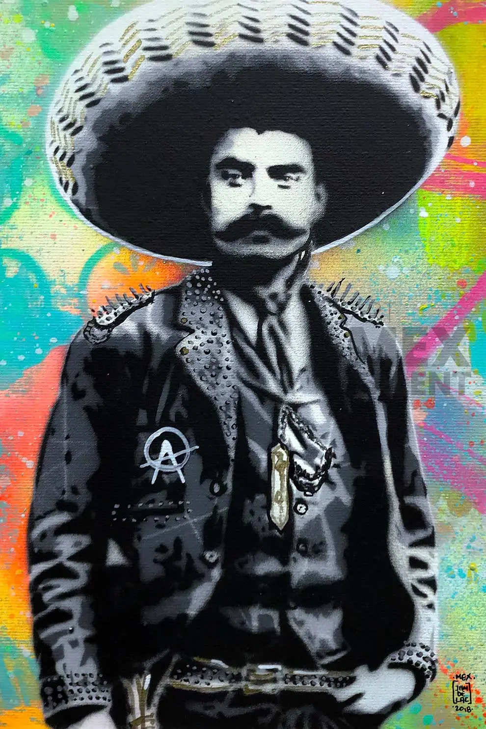 Whispers Before the Storm.The gray-toned character against a vibrant background reveals Jamdelac’s desire to pay tribute to Mexico’s colorful folklore, while still honoring the seriousness with which the figures of our national history embraced their roles as agents of change. The mix of curved and straight lines feel like whispers carried by the wind—whispers that foretold a Revolution.